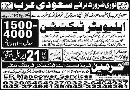 Elevator Technician Jobs 2026 In Saudi Arabia announce the Contract career opportunities for the post of See Below Ad in Saudi Arabia for the fresh and experienced candidates on Contract basis who have Check Advertisement degree. Posted date of this post is 17/04/2026 and the last date is 21/05/2026. if you are eligible for this job apply before due date.