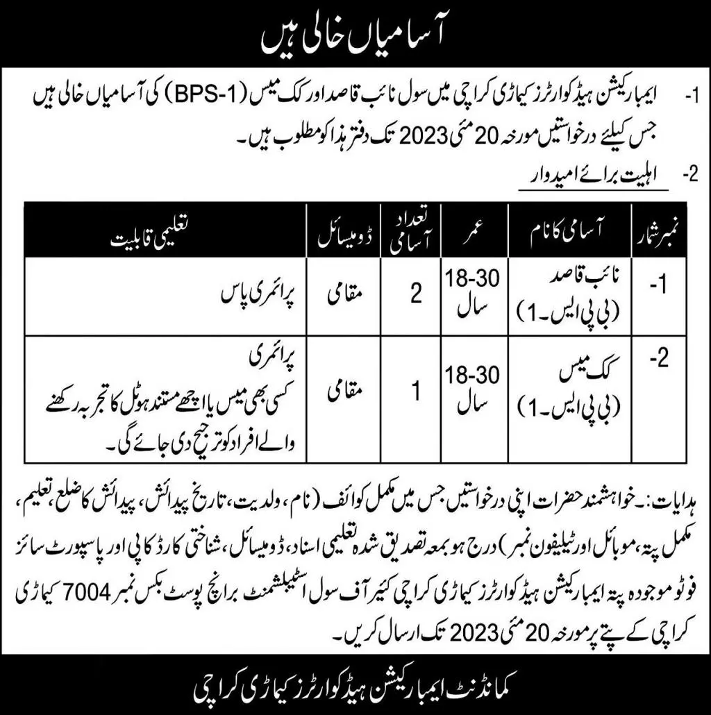 Embarkation Headquarter Karachi Jobs 2023 announce the Contract career opportunities for the post of See Below Ad in Sindh,Karachi for the fresh and experienced candidates on Contract basis who have Check Advertisement degree. Posted date of this post is 30/04/2023 and the last date is 20/05/2023. if you are eligible for this job apply before due date.