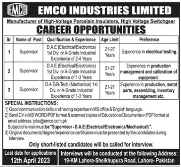 - EMCO Industries Limited invites applications for job positions advertised in daily Jang dated 26 March 2023 for following vacancies in Lahore, lahore Punjab Pakistan.supervisor electricalsupervisorsupervisor electronics and supervisor mechanical Candidates with Bachelor and DAE etc. educational background will be preferred.