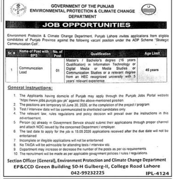 Environment Protection And Climate Control Jobs 2026 announce the Contract career opportunities for the post of See Below Ad in Punjab, Lahore for the fresh and experienced candidates on Contract basis who have Check Advertisement degree. Posted date of this post is 26/04/2026 and the last date is 15/05/2026. if you are eligible for this job apply before due date.