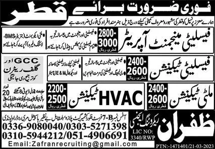 Facility Technician and HVAC Technician jobs in Qatar 2023 announce the Contract career opportunities for the post of See Below Ad in Qatar for the fresh and experienced candidates on Contract basis who have Check Advertisement degree. Posted date of this post is 30/03/2023 and the last date is 27/04/2023. if you are eligible for this job apply before due date.