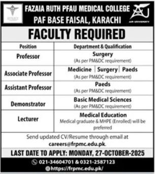 Faculty Required At Fazaia Ruth PFAU Medical College announce the Contract career opportunities for the post of See Below Ad in Sindh, Karachi for the fresh and experienced candidates on Contract basis who have Check Advertisement degree. Posted date of this post is 12/10/2025 and the last date is 27/10/2025. if you are eligible for this job apply before due date.