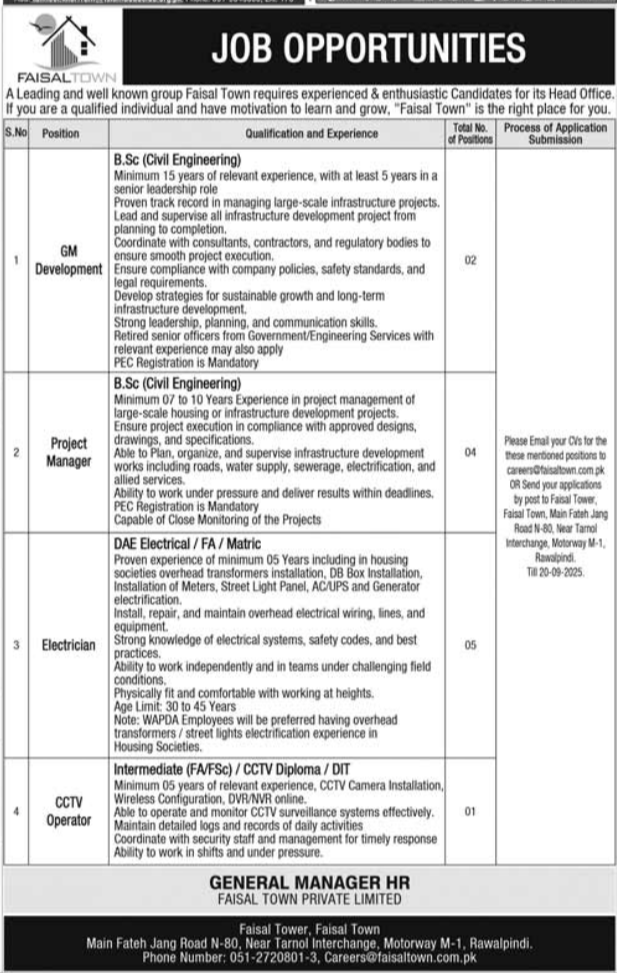 Email your CVs to careers@faisaltown.com.pk OR send your applications by post to Faisal Tower, Faisal Town, Main Fateh Jang Road N-80, Near Tarnol Interchange, Motorway M-1, Rawalpindi. The last date for application submission is September 20, 2025 [1.1].