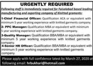 Faisalabad Manufacturing and Exporting Company Jobs announce the Contract career opportunities for the post of See Below Ad in Punjab,Faisalabad for the fresh and experienced candidates on Contract basis who have Check Advertisement degree. Posted date of this post is 07/03/2022 and the last date is 27/03/2022. if you are eligible for this job apply before due date.