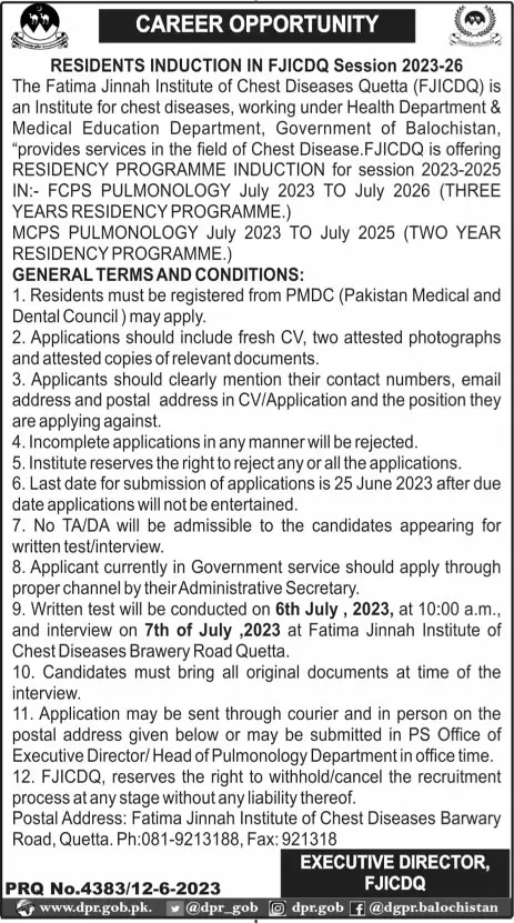 - 9. Written test will be conducted on 6th July, 2023, at 10:00 a.m., and interview on 7th of July,2023 at Fatima Jinnah Institute of Chest Diseases Brawery Road Quetta.