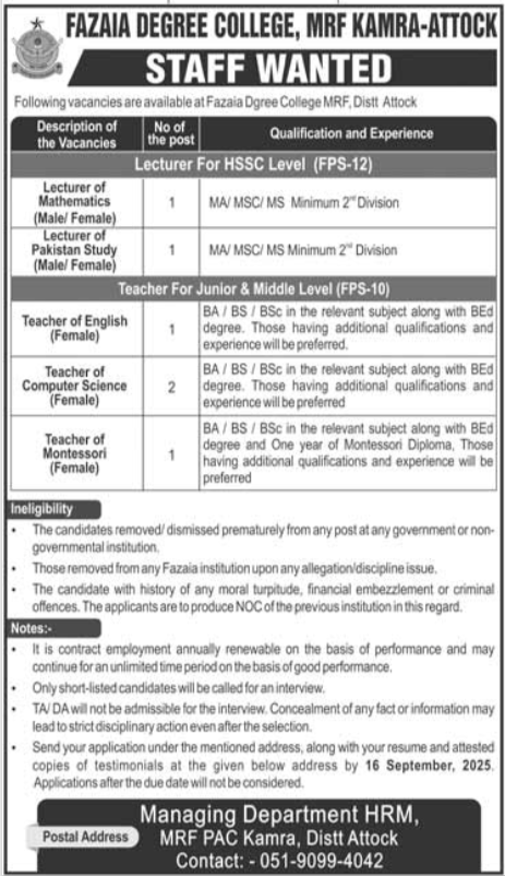 FAZAIA DEGREE COLLEGE, MRF KAMRA-ATTOCK STAFF WANTED
