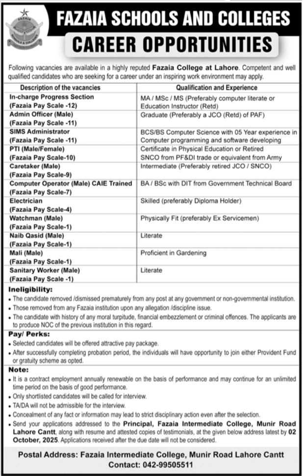 Fazaia Intermediate College Munir Road Lahore Jobs 2025 announce the Contract career opportunities for the post of See Below Ad in Punjab, Lahore for the fresh and experienced candidates on Contract basis who have Check Advertisement degree. Posted date of this post is 26/09/2025 and the last date is 02/10/2025. if you are eligible for this job apply before due date.