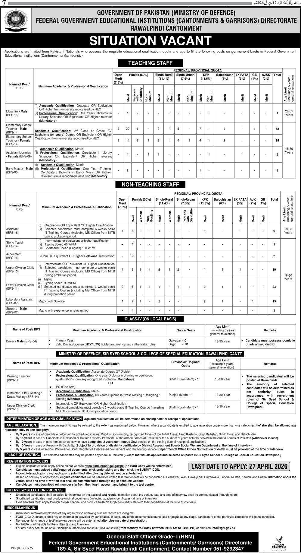 Federal Government Educational Institutions Jobs 2026 announce the Contract career opportunities for the post of See Below Ad in Punjab, Rawalpindi for the fresh and experienced candidates on Contract basis who have Check Advertisement degree. Posted date of this post is 12/04/2026 and the last date is 27/04/2026. if you are eligible for this job apply before due date.
