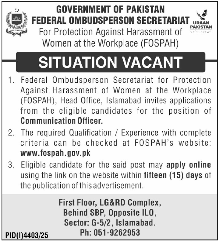 - Federal Ombudsperson Secretariat for Protection Against Harassment of Women at the Workplace (FOSPAH), Head Office, Islamabad invites applications from the eligible candidates for the position of Communication Officer.