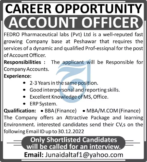 Fedro Pharmaceutical Labs Pvt Limited Jobs 2022 announce the Contract career opportunities for the post of See Below Ad in Khyber Pakhtunkhwa, Peshawar for the fresh and experienced candidates on Contract basis who have Check Advertisement degree. Posted date of this post is 23/12/2022 and the last date is 30/12/2022. if you are eligible for this job apply before due date.