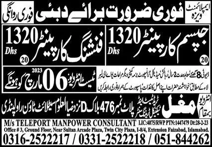 Finishing Carpenter & Gypsum Carpenter Jobs 2023 in Dubai announce the Contract career opportunities for the post of See Below Ad in Dubai for the fresh and experienced candidates on Contract basis who have Check Advertisement degree. Posted date of this post is 03/03/2023 and the last date is 06/03/2023. if you are eligible for this job apply before due date.