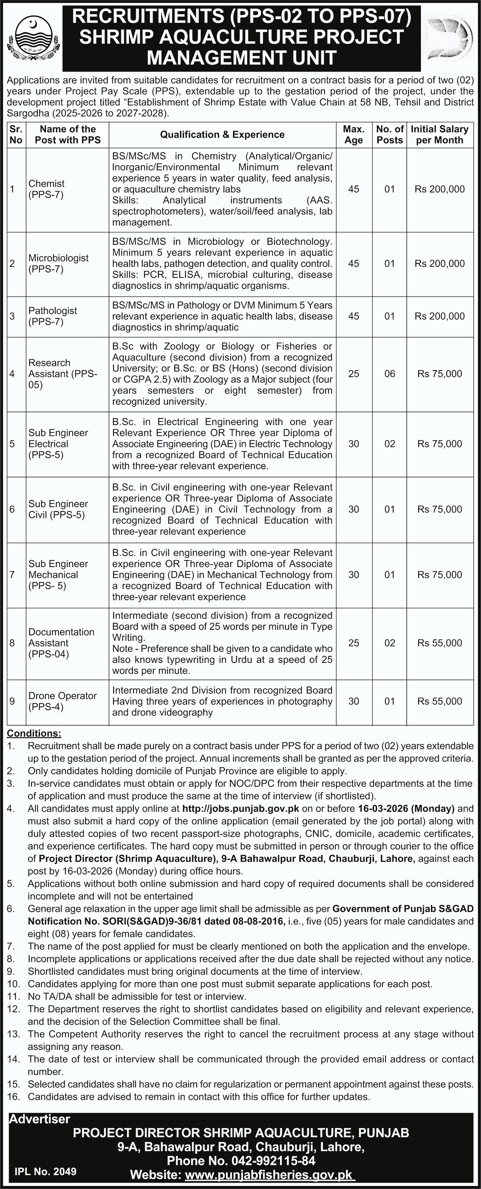 Fisheries Department Lahore Jobs 2026 announce the Contract career opportunities for the post of See Below Ad in Punjab, Lahore for the fresh and experienced candidates on Contract basis who have Check Advertisement degree. Posted date of this post is 26/02/2026 and the last date is 16/03/2026. if you are eligible for this job apply before due date.