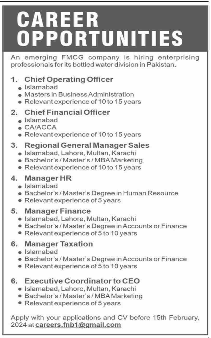 FMCG Company Islamabad Jobs 2024 announce the Contract career opportunities for the post of See Below Ad in Federal, Islamabad for the fresh and experienced candidates on Contract basis who have Check Advertisement degree. Posted date of this post is 21/01/2024 and the last date is 15/02/2024. if you are eligible for this job apply before due date.