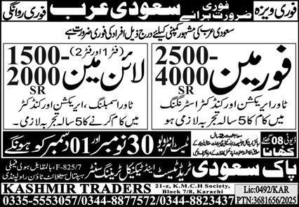 Forman And Line Man Jobs in Saudia Arabia 2025 announce the Contract career opportunities for the post of See Below Ad in Saudi Arabia for the fresh and experienced candidates on Contract basis who have Check Advertisement degree. Posted date of this post is 27/11/2025 and the last date is 01/12/2025. if you are eligible for this job apply before due date.