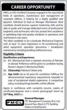 - FTC Management Company Pvt Limited Karachi, karachi Sindh Pakistan invites applications from eligible candidates for the post of manager mechanical as per advertisement of May 14, 2023 published in daily Jang Newspaper. Persons with Others and B.E etc. education can apply.