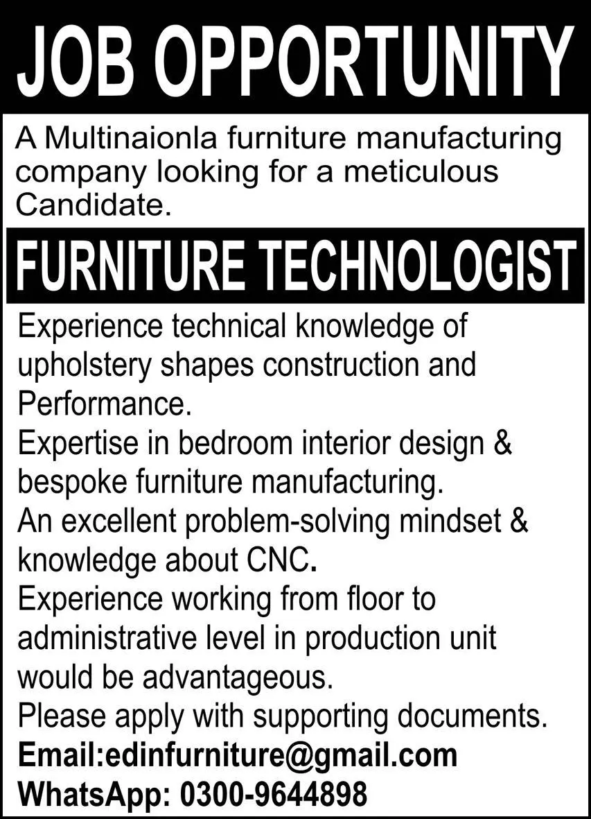 - Furniture Manufacturing Company jobs advertisement dated about 20 August 2023 in daily Express Newspaper invites application for the vacant post of furniture technologist in Lahore, lahore Punjab Pakistan. Educational qualifications required Intermediate and Matric etc.