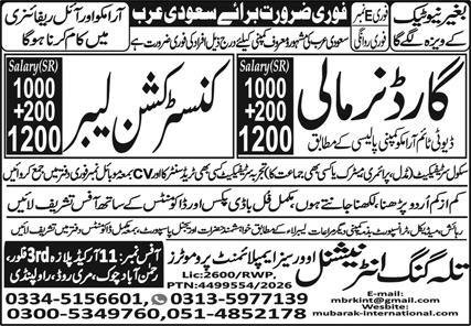 Gardener & Construction Labor Jobs 2026 In Saudi Arabia announce the Contract career opportunities for the post of See Below Ad in Saudi Arabia for the fresh and experienced candidates on Contract basis who have Check Advertisement degree. Posted date of this post is 03/04/2026 and the last date is 10/04/2026. if you are eligible for this job apply before due date.