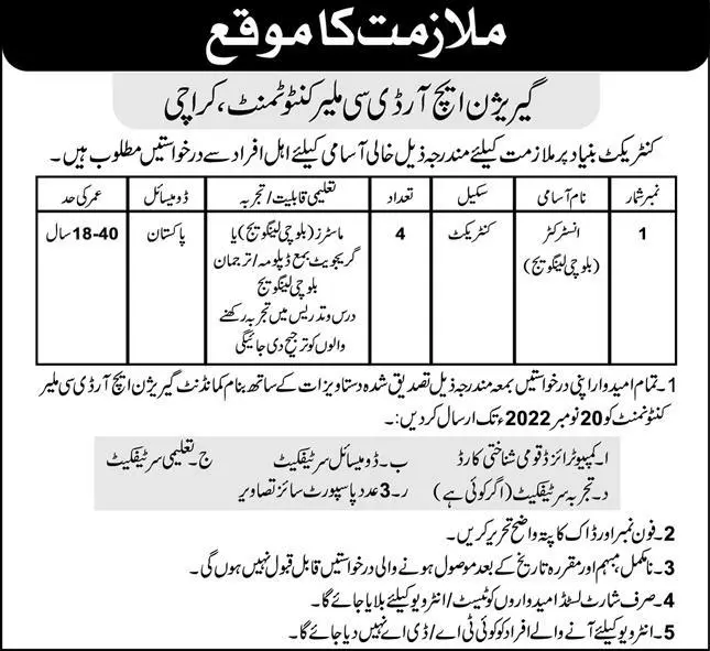 Garrison HRDC Malir Cantt Jobs 2022 announce the Contract career opportunities for the post of See Below Ad in Sindh, Karachi for the fresh and experienced candidates on Contract basis who have Graduation degree. Posted date of this post is 06/11/2022 and the last date is 20/11/2022. if you are eligible for this job apply before due date.