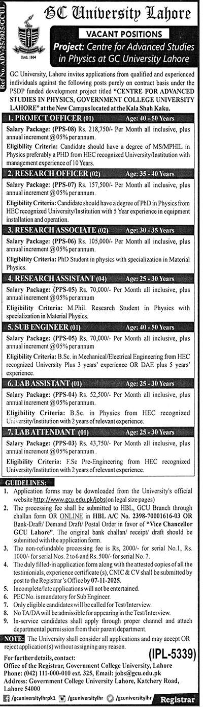 GC University Lahore Jobs 2025 announce the Contract career opportunities for the post of See Below Ad in Punjab, Lahore for the fresh and experienced candidates on Contract basis who have Check Advertisement degree. Posted date of this post is 18/10/2025 and the last date is 07/11/2025. if you are eligible for this job apply before due date.