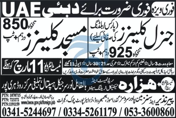 General Cleaner and Masjid Cleaner jobs in Dubai 2023 announce the Contract career opportunities for the post of See Below Ad in Dubai for the fresh and experienced candidates on Contract basis who have Check Advertisement degree. Posted date of this post is 09/03/2023 and the last date is 11/03/2023. if you are eligible for this job apply before due date.