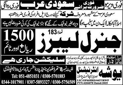 General Labour Jobs in Saudia Arabia 2025 announce the Contract career opportunities for the post of See Below Ad in Saudi Arabia for the fresh and experienced candidates on Contract basis who have Check Advertisement degree. Posted date of this post is 04/12/2025 and the last date is 25/12/2025. if you are eligible for this job apply before due date.