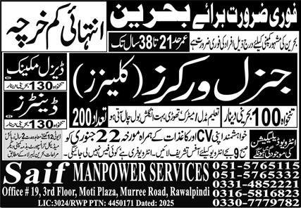General Worker Jobs in Bahrin 2026 announce the Contract career opportunities for the post of See Below Ad in Bahrain for the fresh and experienced candidates on Contract basis who have Check Advertisement degree. Posted date of this post is 20/01/2026 and the last date is 22/01/2026. if you are eligible for this job apply before due date.