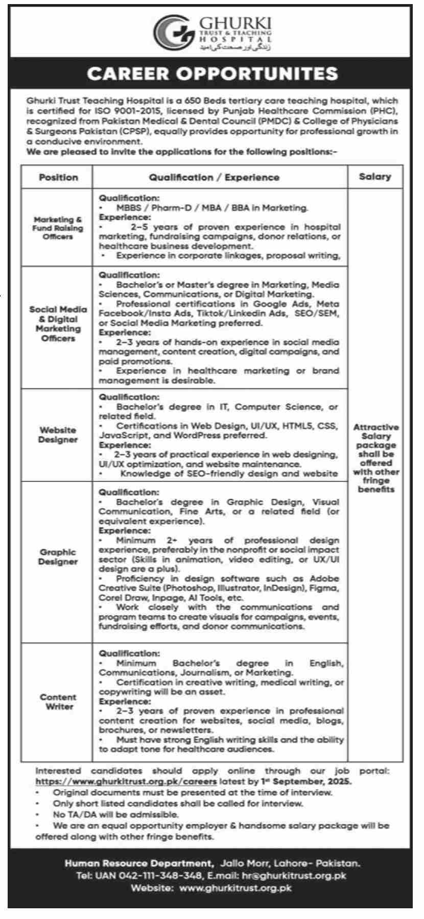 Ghurki Trust Teaching Hospital GTTH Lahore Jobs 2025 announce the Contract career opportunities for the post of See Below Ad in Punjab, Lahore for the fresh and experienced candidates on Contract basis who have Check Advertisement degree. Posted date of this post is 17/08/2025 and the last date is 01/09/2025. if you are eligible for this job apply before due date.