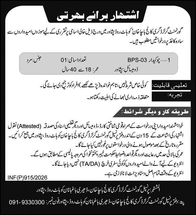 Government Girls Degree College Bacha Khan Jobs 2026 announce the Contract career opportunities for the post of See Below Ad in Khyber Pakhtunkhwa, Peshawar for the fresh and experienced candidates on Contract basis who have Check Advertisement degree. Posted date of this post is 28/02/2026 and the last date is 14/03/2026. if you are eligible for this job apply before due date.
