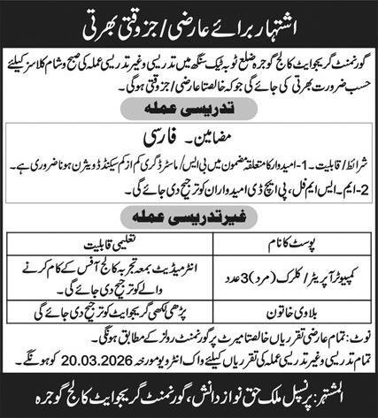 Government Graduate College Gojra Jobs 2026 announce the Contract career opportunities for the post of See Below Ad in Punjab, Toba Tek Singh for the fresh and experienced candidates on Contract basis who have Check Advertisement degree. Posted date of this post is 07/03/2026 and the last date is 20/03/2026. if you are eligible for this job apply before due date.