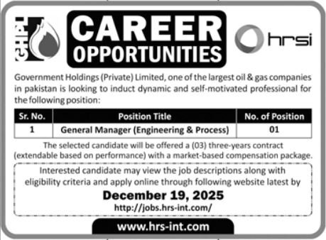 Government Holding Private Limited GPHL Jobs 2025 announce the Contract career opportunities for the post of See Below Ad in Federal, Islamabad for the fresh and experienced candidates on Contract basis who have Check Advertisement degree. Posted date of this post is 03/12/2025 and the last date is 19/12/2025. if you are eligible for this job apply before due date.