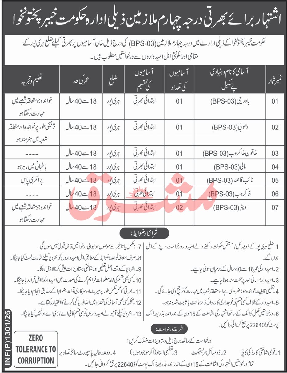 Government Organization Haripur Jobs 206 announce the Contract career opportunities for the post of See Below Ad in Khyber Pakhtunkhwa, Sindh for the fresh and experienced candidates on Contract basis who have Check Advertisement degree. Posted date of this post is 27/03/2026 and the last date is 11/04/2026. if you are eligible for this job apply before due date.