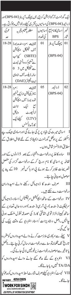 A government organization in Karachi invites applications for appointment to the posts of Pumping Operator (BPS-04) and Driver (BPS-04).