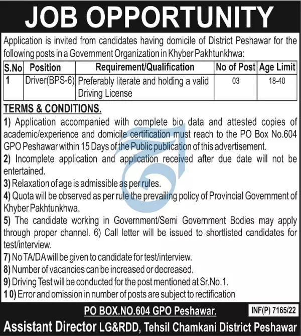 - Government Sector Organization is looking for candidates for following posts as per job advertisement published in daily Aaj Newspaper of December 24, 2022 for location Peshawar, Peshawar Khyber Pakhtunkhwa KPK Pakistan: driver