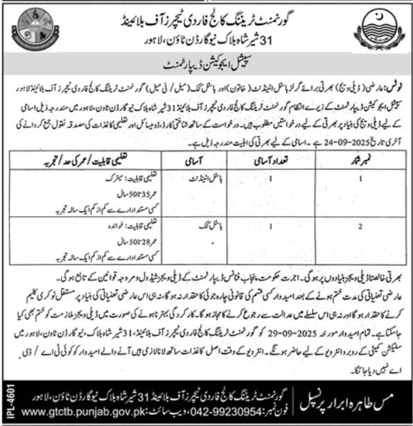 Government Training College for the Teacher of Blind Jobs announce the Contract career opportunities for the post of See Below Ad in Punjab, Lahore for the fresh and experienced candidates on Contract basis who have Check Advertisement degree. Posted date of this post is 13/09/2025 and the last date is 24/09/2025. if you are eligible for this job apply before due date.