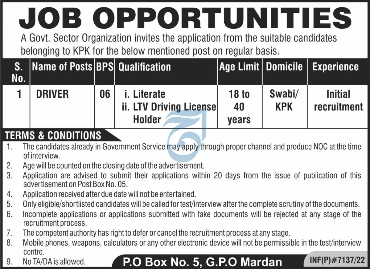 - Government Sector Organization is looking for candidates for following posts as per job advertisement published in daily Aaj Newspaper of December 24, 2022 for location Mardan, mardan Khyber Pakhtunkhwa KPK Pakistan: driver Candidates with Matric and Middle etc.