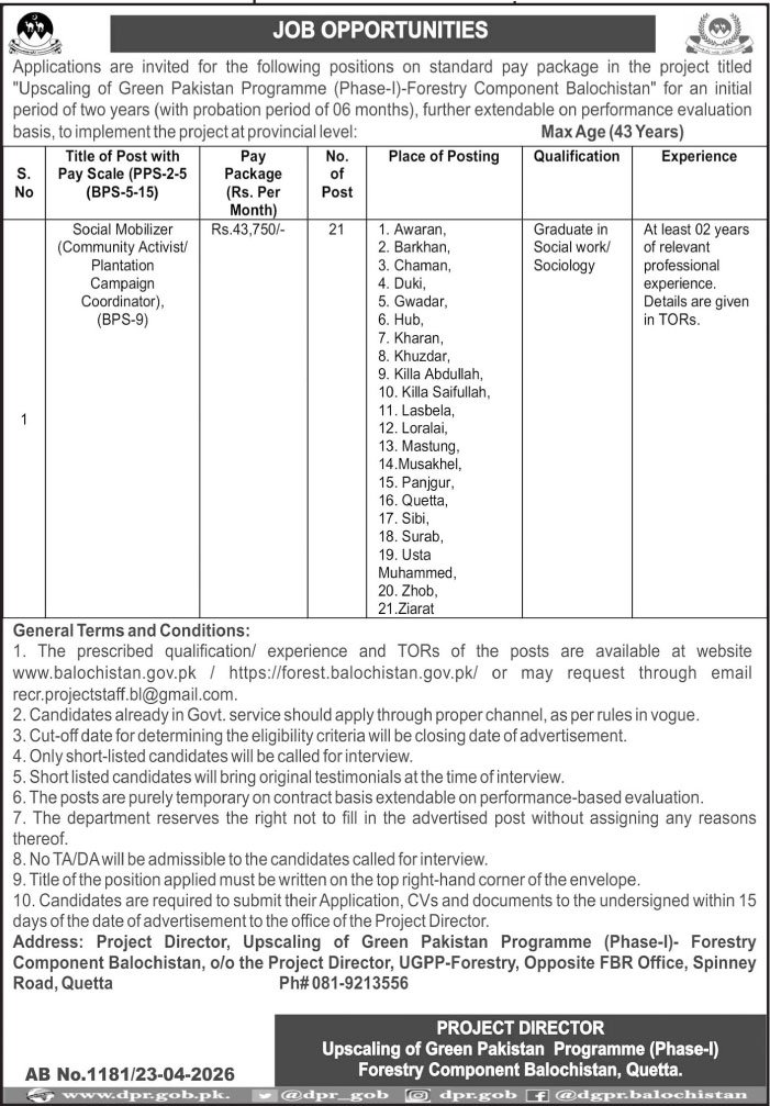 Green Pakistan Programme Quetta Job 2026 announce the Contract career opportunities for the post of See Below Ad in Balochistan, Quetta for the fresh and experienced candidates on Contract basis who have Check Advertisement degree. Posted date of this post is 24/04/2026 and the last date is 09/05/2026. if you are eligible for this job apply before due date.
