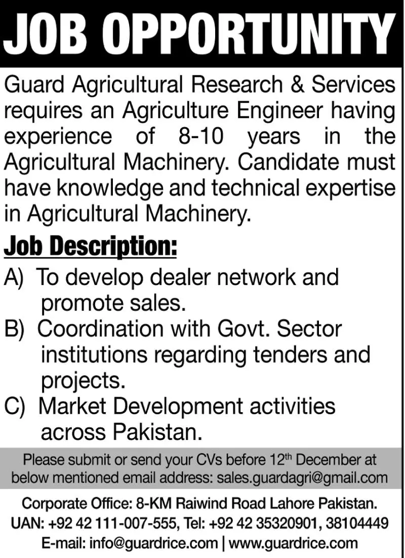 Guard Agriculture Research Services Jobs 2022 announce the Contract career opportunities for the post of See Below Ad in Punjab, Lahore for the fresh and experienced candidates on Contract basis who have Check Advertisement degree. Posted date of this post is 07/12/2022 and the last date is 12/12/2022. if you are eligible for this job apply before due date.
