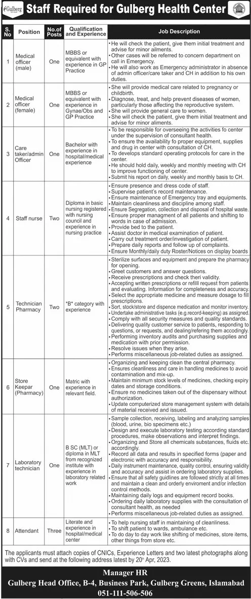 - Gulberg Health Center Islamabad, islamabad Islamabad Pakistan invites applications from eligible candidates for the post of laboratory technician, female medical officer, care taker, attendant, male medical officer, staff nurse, technician pharmacy, admin officer and store keeper pharmacy as per advertisement of April 2, 2023 published in daily Jang Newspaper. Candidates with B Pharmacy, Matric, Bachelor, Intermediate, Others, Primary and MBBS etc.