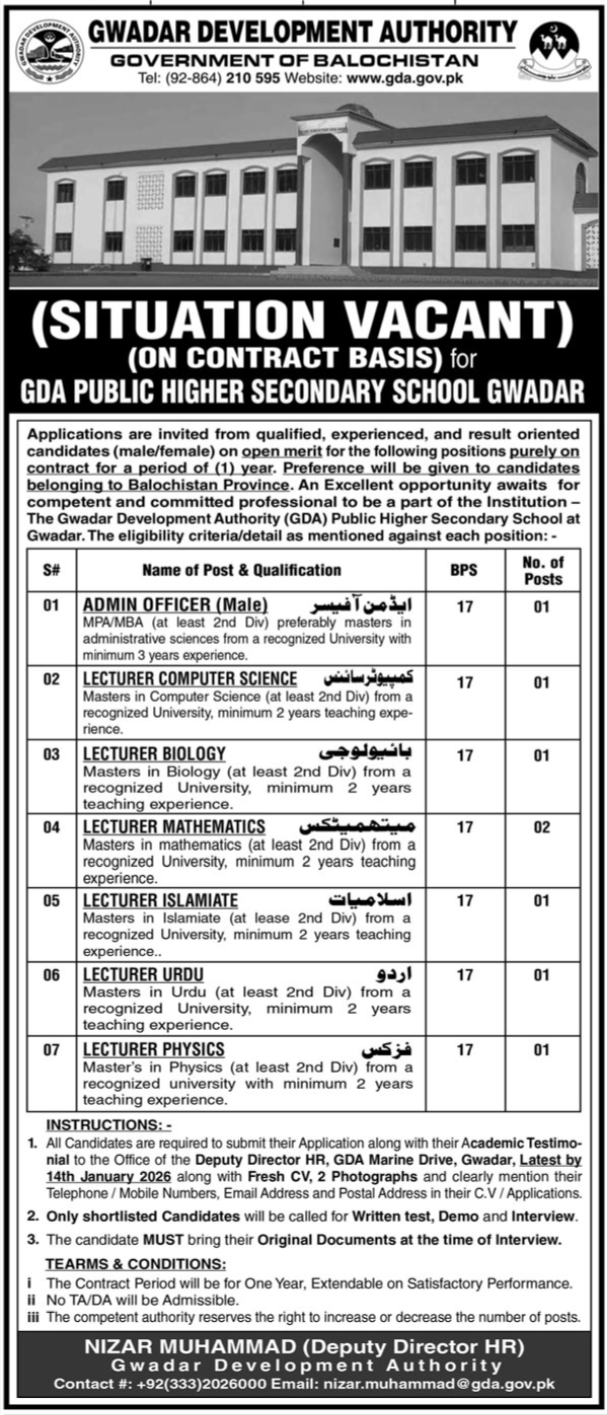 (SITUATION VACANT) (ON CONTRACT BASIS) for GDA PUBLIC HIGHER SECONDARY SCHOOL GWADAR