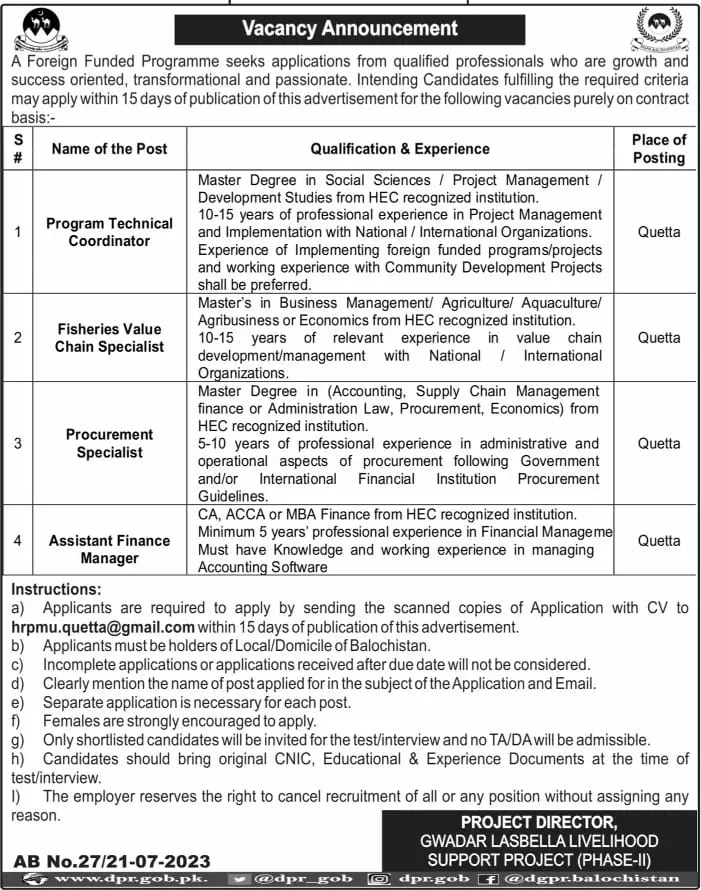 Gwadar Lasbela Livelihood Support Project Quetta Jobs 2023 announce the Contract career opportunities for the post of See Below Ad in Balochistan,Quetta for the fresh and experienced candidates on Contract basis who have Check Advertisement degree. Posted date of this post is 22/07/2023 and the last date is 05/08/2023. if you are eligible for this job apply before due date.
