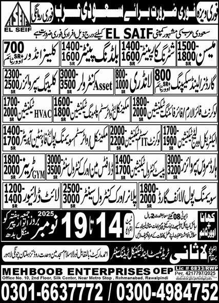 Gym Trainer & Fountain Operator Jobs 2025 In Saudi Arabia announce the Contract career opportunities for the post of See Below Ad in Saudi Arabia for the fresh and experienced candidates on Contract basis who have Check Advertisement degree. Posted date of this post is 13/11/2025 and the last date is 19/11/2025. if you are eligible for this job apply before due date.