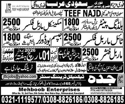 Gypsum Board Fixer & Brush Painter Jobs 2026 In Saudi Arabia announce the Contract career opportunities for the post of See Below Ad in Saudi Arabia for the fresh and experienced candidates on Contract basis who have Check Advertisement degree. Posted date of this post is 20/02/2026 and the last date is 01/03/2026. if you are eligible for this job apply before due date.