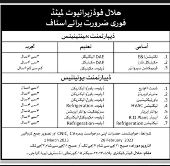 Halal Food Private Limited Jobs 2023 announce the Contract career opportunities for the post of See Below Ad in Sindh, Karachi for the fresh and experienced candidates on Contract basis who have Check Advertisement degree. Posted date of this post is 26/02/2023 and the last date is 01/03/2023. if you are eligible for this job apply before due date.