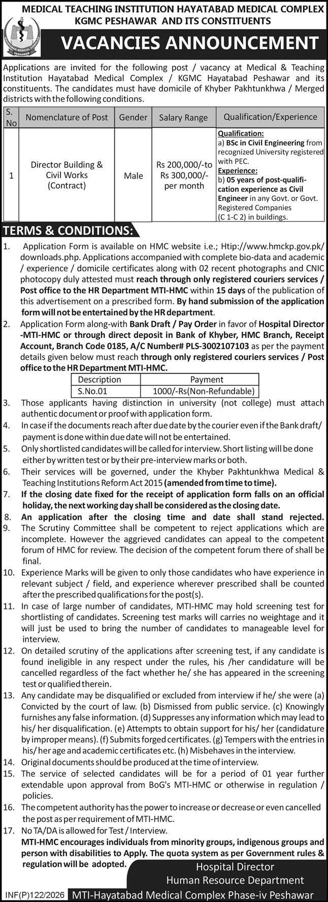 - Application Form along with Bank Draft/Pay Order in favor of Hospital Director -MTI-HMC or through direct deposit in Bank of Khyber, HMC Branch, Receipt Account, Branch Code 0185, A/C Number# PLS-3002107103 as per the payment details given below must reach through only registered couriers services / Post office to the HR Department MTI-HMC.