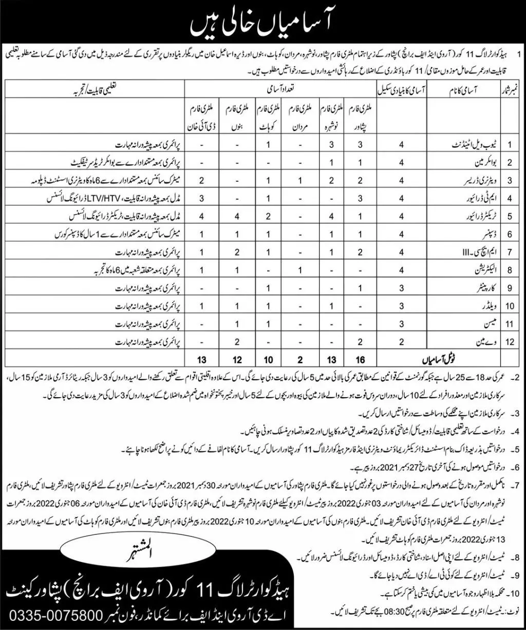 Head Coarter Log 11 Coure (RV & F Branch) Peshawer Jobs announce the Permanent career opportunities for the post of See Below Ad in Peshawar for the fresh and experienced candidates on Permanent basis who have Check Advertisement degree. Posted date of this post is 12/12/2021 and the last date is 27/12/2021. if you are eligible for this job apply before due date.
