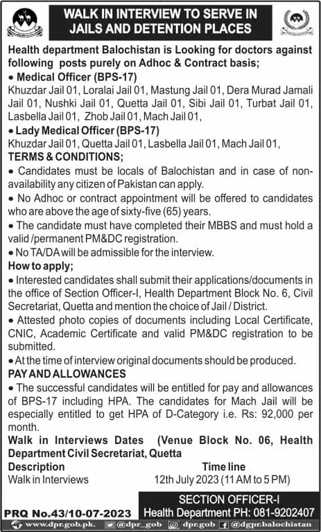 - Interested candidates shall submit their applications/documents in the office of Section Officer-I, Health Department Block No. 6, Civil Secretariat, Quetta and mention the choice of Jail/District.
