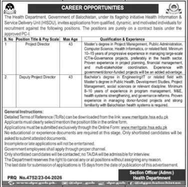 Health Department Balochistan Jobs 2026 announce the Contract career opportunities for the post of See Below Ad in Balochistan, Quetta for the fresh and experienced candidates on Contract basis who have Check Advertisement degree. Posted date of this post is 24/04/2026 and the last date is 09/05/2026. if you are eligible for this job apply before due date.