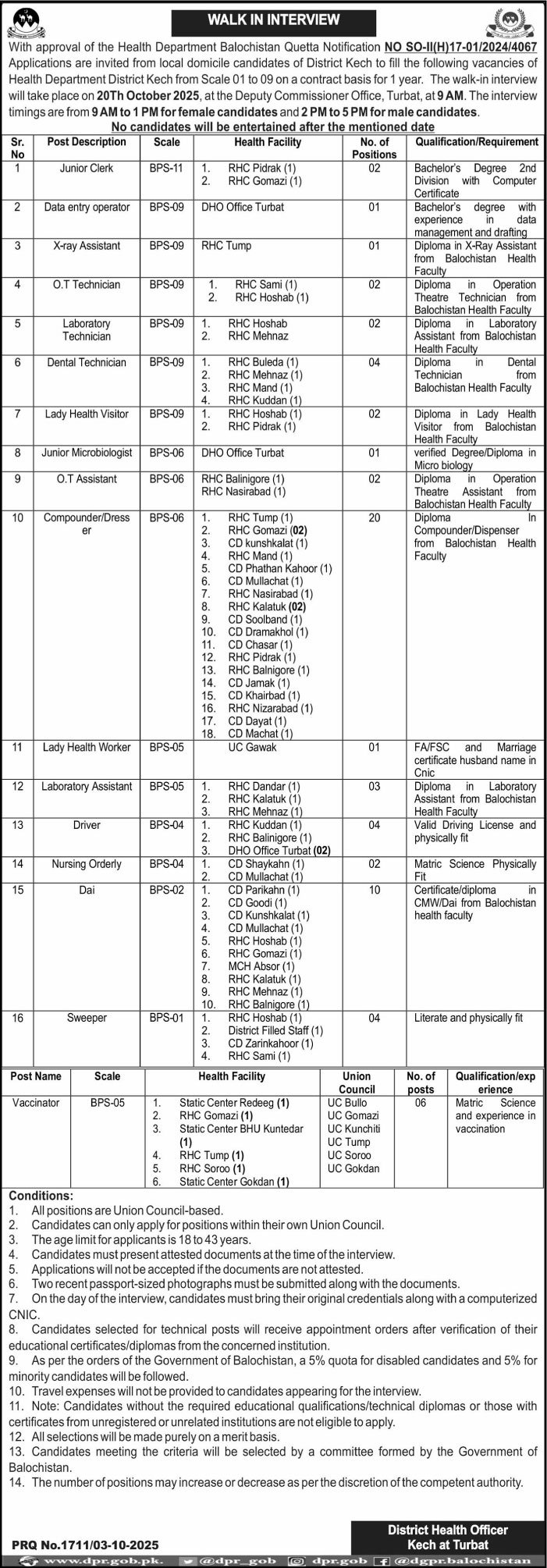 With the approval of the Health Department Balochistan Quetta Notification NO. SO-II(H)17-01/2024/4067, applications are invited from local domicile candidates of District Kech to fill the following vacancies of the Health Department District Kech from Scale 1 to 09 on a contract basis for 1 year. The walk-in interview will take place on 20th October 2025, at The Deputy Commissioner Office, Turbat, at 9 AM. The interview timings are from 9 AM to 1 PM for female candidates and 2 PM to 5 PM for male candidates.