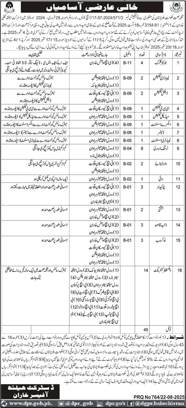 By the approval of the Health Department, Government of Balochistan, under Notification No. 2024/571/3-57-17(A) S. and II dated February 28, 2024, and Chairman District Health Committee Kharan's letter No. 11/61-3154 dated August 18, 2025, applications are invited from local candidates of District Kharan for filling the following temporary vacant positions in Rural Health Centers and District Health Department. The last date for submission of applications is September 4, 2025. No application will be accepted after the said date. Interviews for positions in Grade 5 to 11 will be held from September 15 to 17, 2025, and for Grade 1 to 4 on September 18, 2025, at the office of the Deputy Commissioner Kharan. No TA/DA will be given to candidates appearing for the interview.
