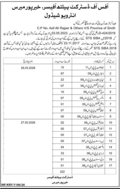 It is reminded that the Health Department issued an advertisement for various vacant posts on 23.11.2017, under which a test was conducted through 2018 STS SIBA Sukkur, in which candidates were shortlisted. These candidates are now informed to appear at the designated location with their original educational documents according to the following interview schedule.